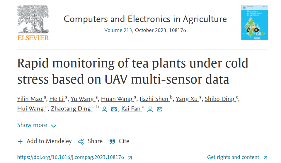 附:Yilin Mao, He Li, Yu Wang, Huan Wang, Jiazhi Shen, Yang Xu, Shibo Ding, Hui Wang, Zhaotang Ding, Kai Fan, Rapid monitoring of tea plants under cold stress based on UAV multi-sensor data,Computers and Electronics in Agriculture,2023, 213,108176.