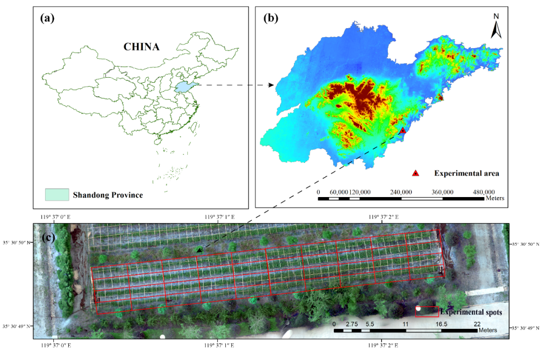 (a)中国的江北茶区之一---山东省(b)日照市茶叶研究所茶园(c)采样地点