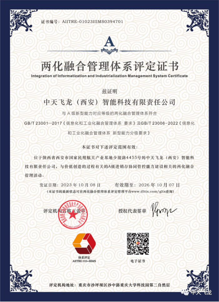 8、中天飞龙荣获“A级 两化融合管理体系评定证书”