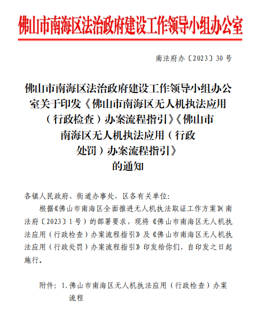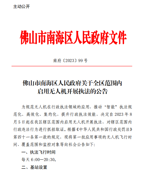 2023年7月,南海区政府印发《佛山市南海区人民政府关于全区范围内启用无人机开展执法的公告》,决定于8月5日起在全区范围内正式启用无人机开展执法,对行政违法行为进行抓拍取证。