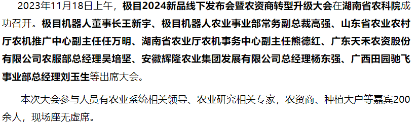 极目机器人创始人王新宇博士开场致词,王新宇表示,极目从2006年成立至今始终坚守“效果、效率、效益、社会责任”的产品价值观。研发的感知技术和喷头经过了七年的演进,从双目视觉感知到ALS激光复眼感知,从CCMS常温双峰弥雾喷头到MCRFF弥雾对转卷扬流体场,产品力越发强大。正因为极目在效果上的执着,才成功地在市场上打响了“打得匀 打得透”的飞防品牌,也获得了广大农资商的支持。