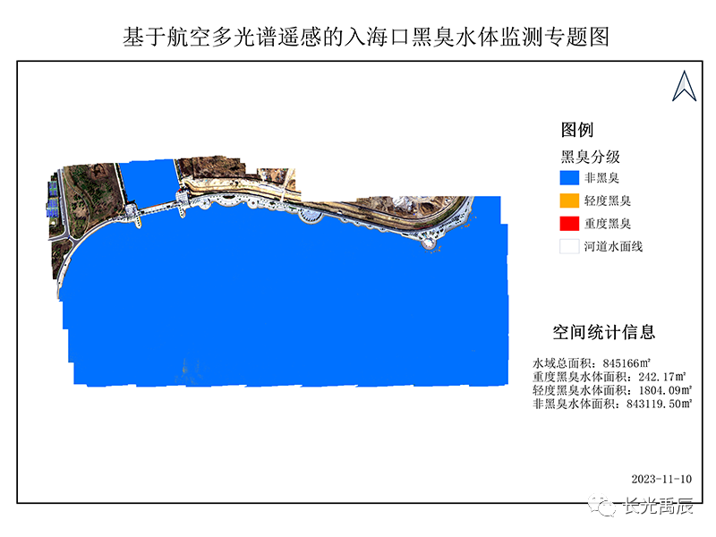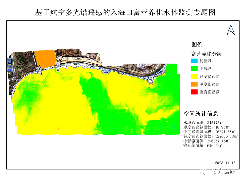 左右滑动查看 点云分布&拼接结果&光谱曲线使用Yusense Map Plus分别进行富营养化与黑臭水分析,可以看出本案例所选入海口中的内流河部分整体呈现中度富营养化情况,海水部分呈现轻度富营养化与中营养趋势。其中轻度富营养化区域主要集中在入海闸口与景观岸线附近,闸口定期开放引起内流河水体流向海洋,同时景观岸线处底质坚固、水下高程较高,水体流速相对较慢,结合水动力分析符合富营养化空间分布规律,同时整体无黑臭水体污染,因此使用DOM填充方法对光谱属性影响较小,可以满足水体监测需求。