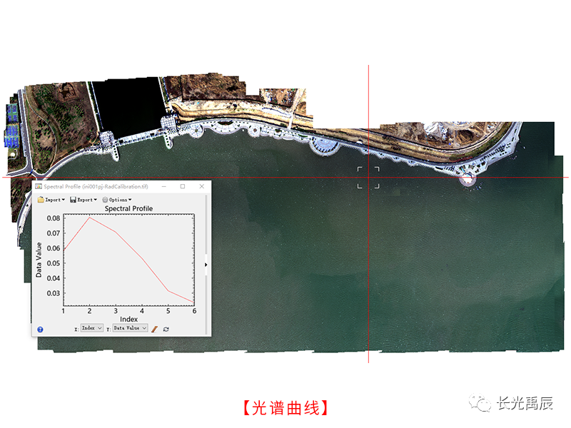 使用Yusense Map软件分步执行波段配准、二维建图*、反射率校正,得到最终具有反射率意义的拼接影像,其中水面部分已进行DOM填充,但海面波浪明显,拼接影像中存在较多波浪与浪花,一定程度影响数据分析,使用Yusense Map Plus查看无波浪水体光谱特征曲线,符合水体光谱反射特征。