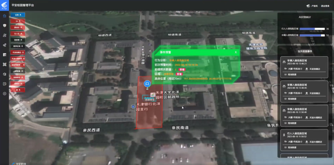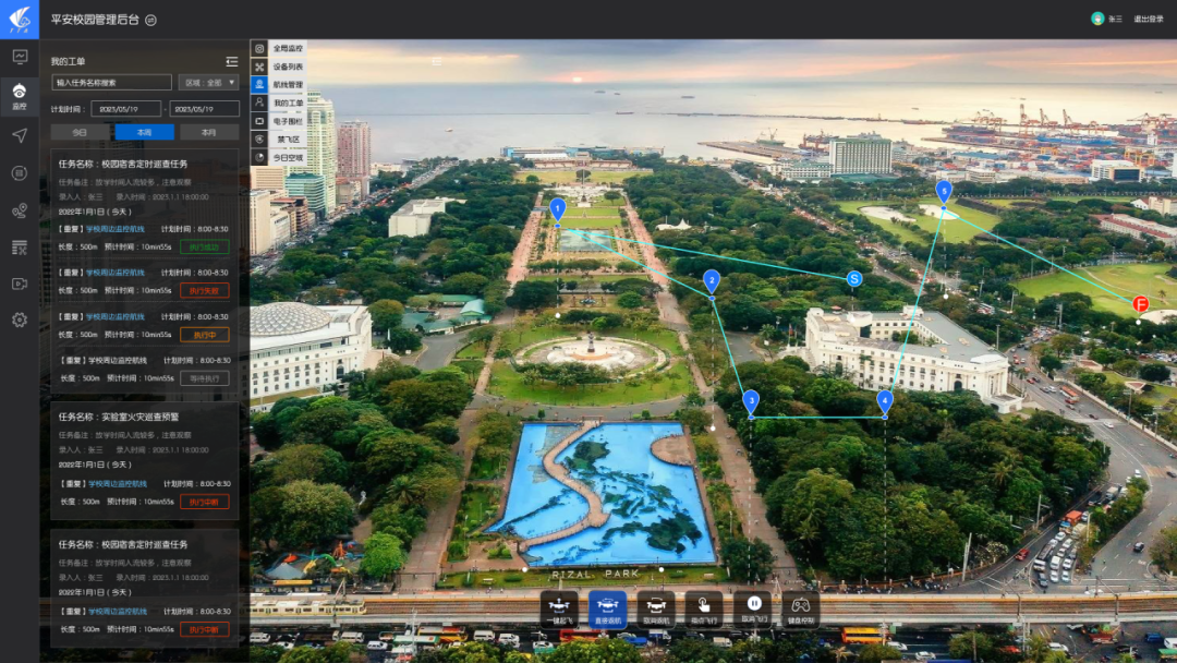 自主巡查任务前,使用无人机拍摄,完成校园内数据采集,建立校园整体的实景三维建模。手动划分各类区域,设定巡航路线。