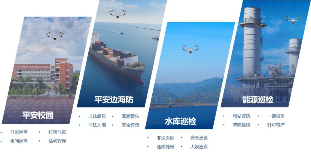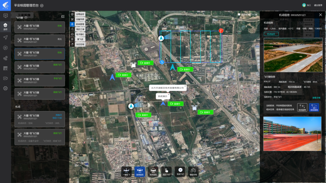 天途智能巡查系统结合大疆机场,通过无人机自主巡查,实时监控、预警危害和巡防提供了巡查、追踪、救援物资投放、气体检测等解决方案,真正实现无人值守!
