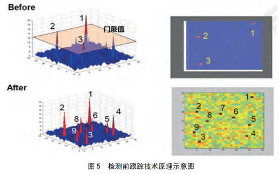 利用雷达探测“低慢小”目标一直都是一个难点,传统的方法是先对每帧原始数据做过门限检测,然后对过门限的测量数据做后续的跟踪处理。这样可以抑制数据流,但不可避免地造成了许多有用信息的损失,特别是对无人机等“低慢小”目标。检测前跟踪技术对未经门限处理的多帧原始数据进行能量积累,使得检测与跟踪同时进行,可以有效提高对“低慢小”目标的检测与跟踪性能。图5为检测前跟踪技术原理示意图。