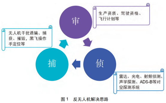 从宏观来看,反无人机的解决思路如图1所示,主要包含“审—侦—捕”三个方面,“审”主要是利用政策手段从源头对黑飞无人机进行约束,“侦”和“捕”则指的是对黑飞无人机的探测和防御,也正是这两部分构成了反无人机系统。