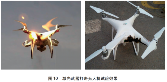 利用激光武器针对大疆精灵4四旋翼无人机进行了多次打击试验,均成功将无人机摧毁击落,试验对无人机的打击效果如图10所示。