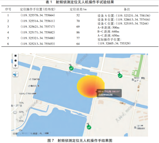 为验证射频侦测设备对无人机操作手的定位精度,试验人员在市区展开试验,三个射频侦测点之间相隔一定距离呈三角形布置,对无人机操作手进行定位,试验结果分别如表1和图7所示。