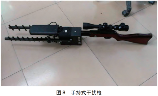图8所示为手持式干扰枪,发现无人机目标后利用该设备瞄准无人机方向对其飞控和图传信号进行干扰,无人机遥控器显示“无人机连接已断开”,操控者无法操控无人机且无法接收回传图像,无人机按预设模式实施迫降,干扰达到预期目标。