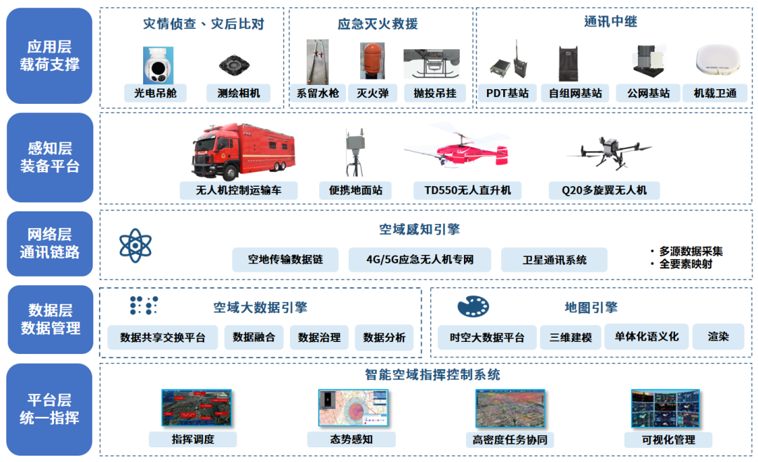 联合飞机智慧应急解决方案,围绕包括事前预防与风险管理、事中处置与救援保障和事后评估与恢复重建等不同阶段的关键任务目标,打通应用层、感知层、网络层、数据层、平台层,形成多手段、全联动、立体高效的五层架构,实现了“无人机+”系统作战模式的全新转变,逐一攻破各场景的难点与瓶颈,为行业解决方案提供更多可能性,打造全球领先的“大安全、全灾种、大应急”的无人装备体系,以科技创新赋能智慧应急。