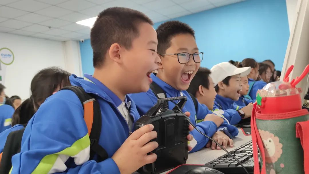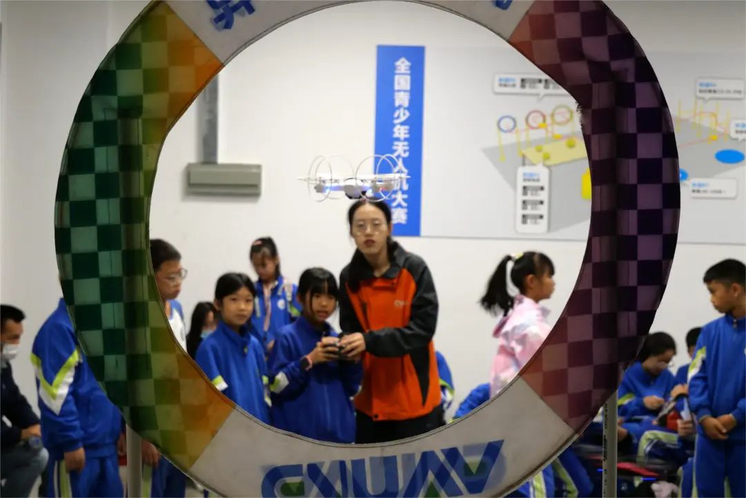 在科技教官现场教学并带着同学们依次进行无人机实操飞行体验,亲身感受飞行带来的乐趣。结合飞行赛道,了解国际国内青少年无人机比赛的基本要求。