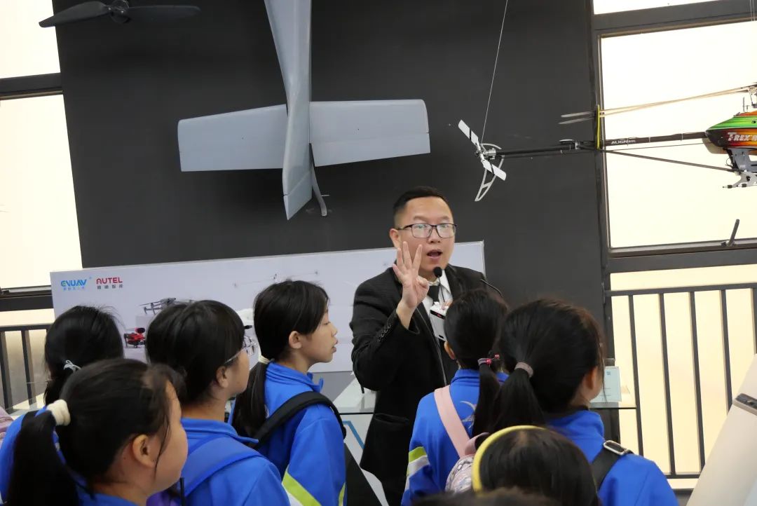 在无人机科普馆里陈列着大大小小的飞机,在老师的讲解下我们知道了,无人机按用途分为军用与民用,按结构分有多旋翼、单旋翼、固定翼。同学们安静的坐着,细听老师的讲解,从飞行器的过去,再穿越到未来,头脑风暴,无限幻想就此展开...