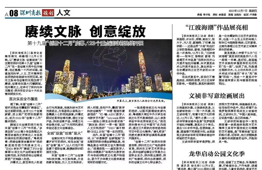 12月6日,深圳市第十九届创意十二月拉开帷幕,将进行为期一个月的涵盖城市科学、人文、艺术精神领域的各项活动,旨在以多元活动搭建跨界融合平台,赓续传统文化和历史文脉,彰显新时代鹏城的创意、创新和创造力。