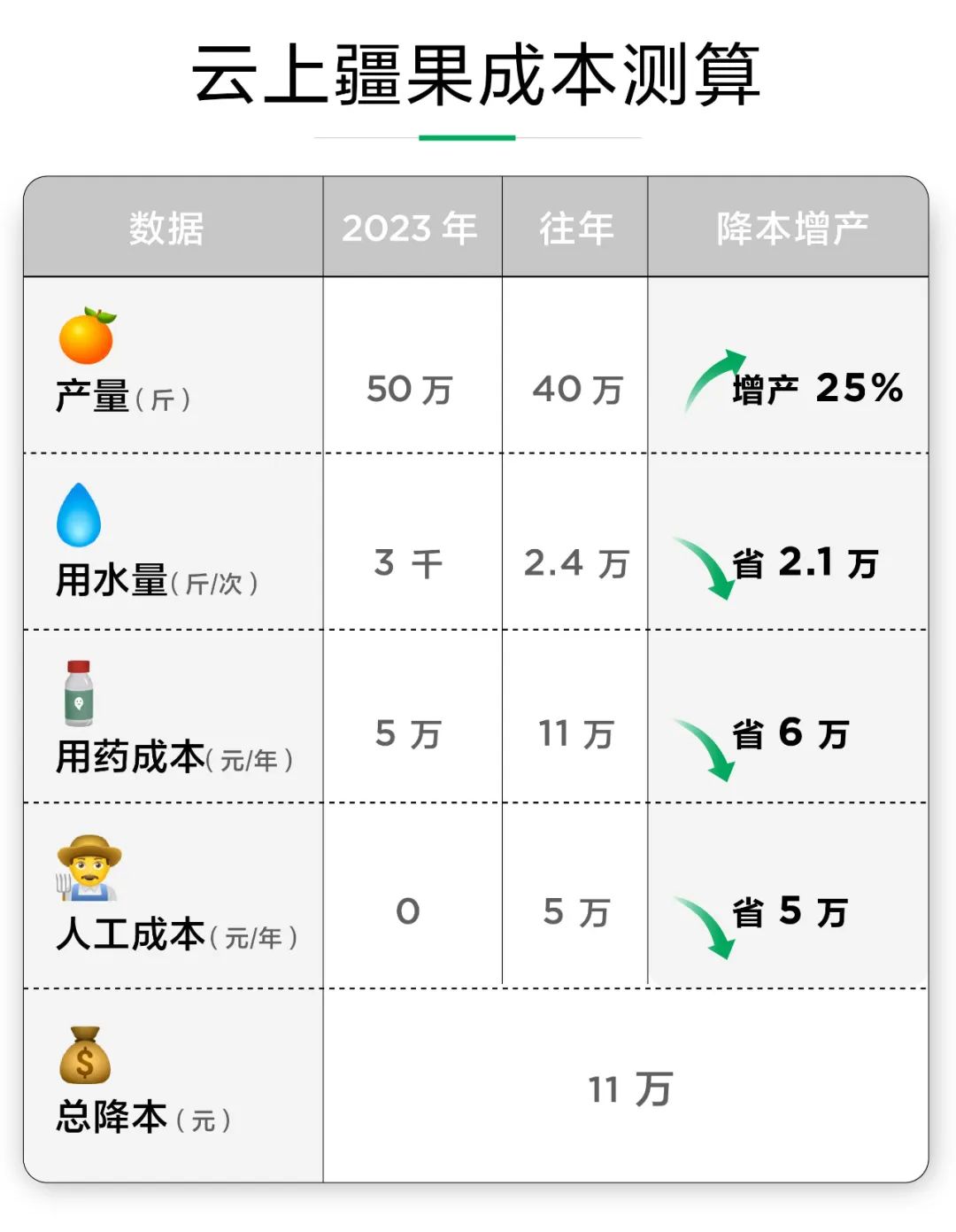 经测算,单棵树平均产量达 125 斤,总节水 42 万斤,有效降本 11 万元,一人用无人机全流程管理果园挑战圆满成功。不仅帮助果农创收,也通过云上小程序连接了城市与乡村。从屏幕一端,享云上丰收。