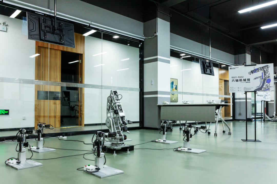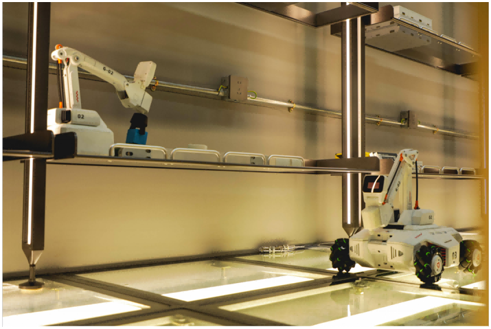 以多个桌面型智能机械臂覆盖整体教学环境,模拟工业4.0背景下的智能仓储情景,各级仓储货架通过搭载可编程机械臂实现物流过程中运输,存储,装卸等环节。学生通过课程学习、编程实践,构建并优化一体化的智能物流系统。