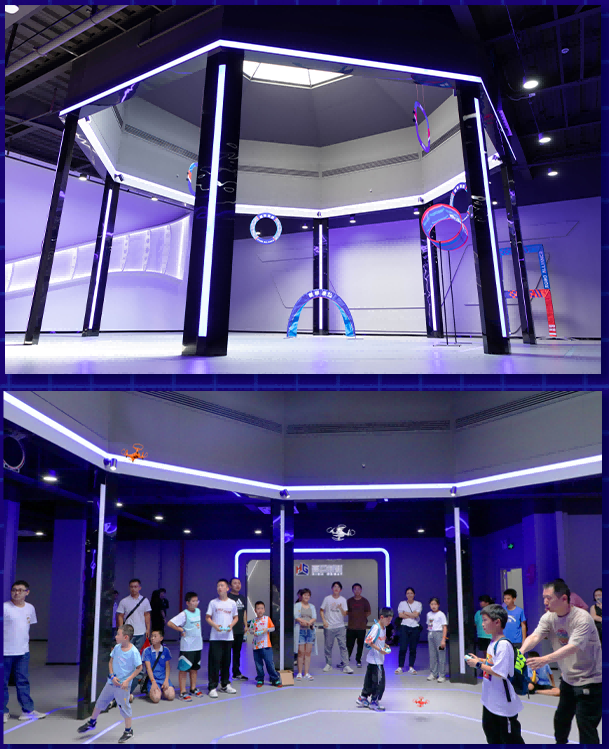 以竞技性为主题,游客参与操控足球无人机进行分组对战,搭配实时积分及灯光氛围,营造对战实感。