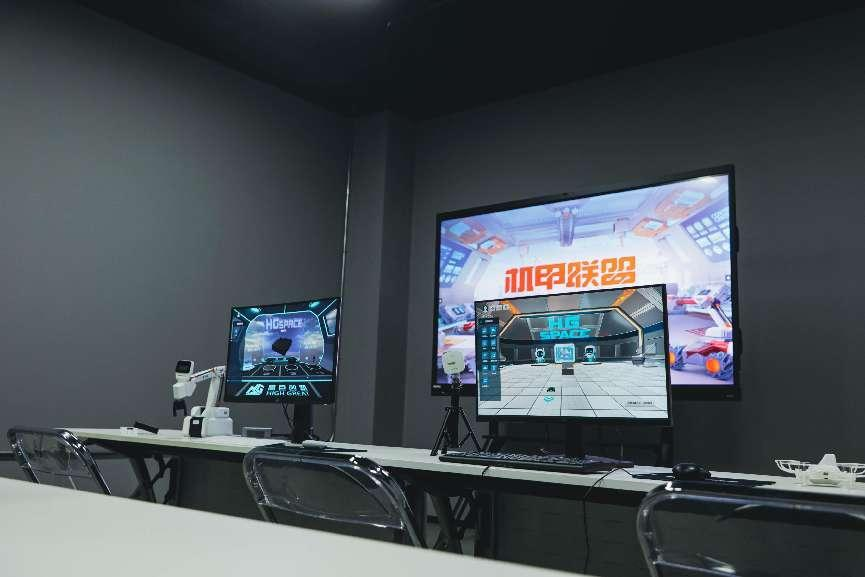 以室内高精度定位编队无人机为核心,学生借用场景搭建实现分组对战教学,进阶学习多机编队同步编程控制,横跨多品类智能硬件产品相互协同配合,提高学生人工智能认知,开发创新思考。