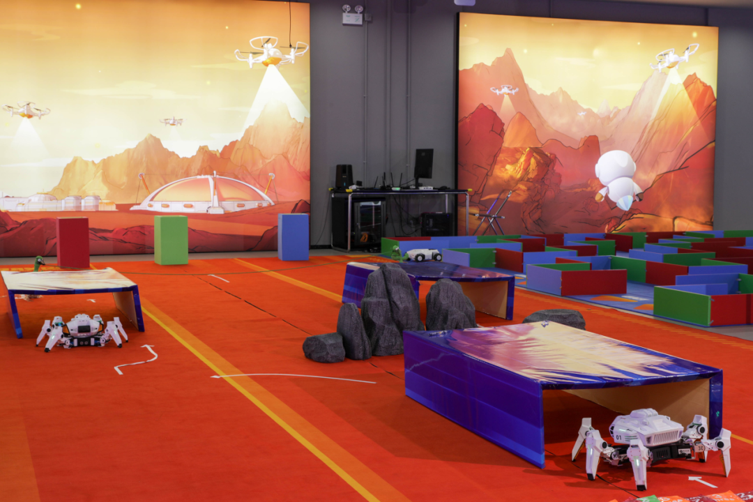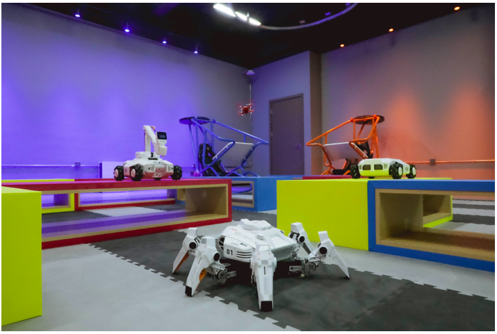 通过搭建立体轨道交通系统,模拟强交互性多层级教学场景。以编程无人车及智能多足机器人为核心,开展编程教学。通过对教学环境中设立多级任务点及随机障碍,还原现实生活场景,学生策划解决方案并通过模拟到最终实现,多方面激发学生创造力与编程实践能力。