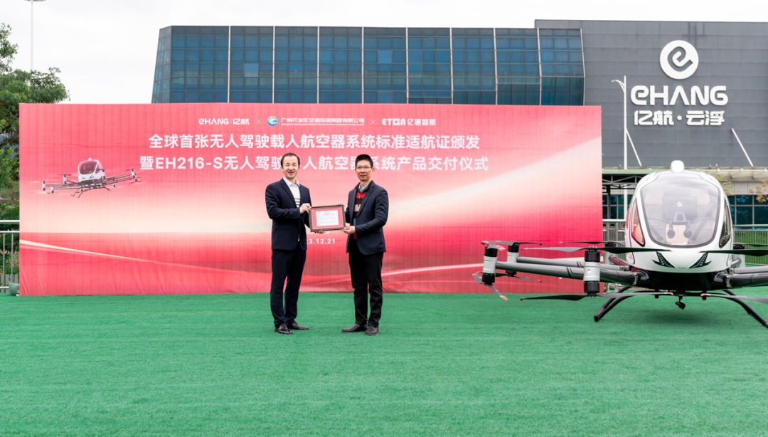 2023年12月21日,全球领先的城市空中交通(UAM)科技企业亿航智能(Nasdaq: EH)(下文简称“亿航智能”)宣布,其EH216-S无人驾驶载人航空器获得由中国民用航空局(下文简称“中国民航局”)颁发的标准适航证,成为全球首个获得适航证的无人驾驶载人电动垂直起降(eVTOL)航空器,取得行业领先。