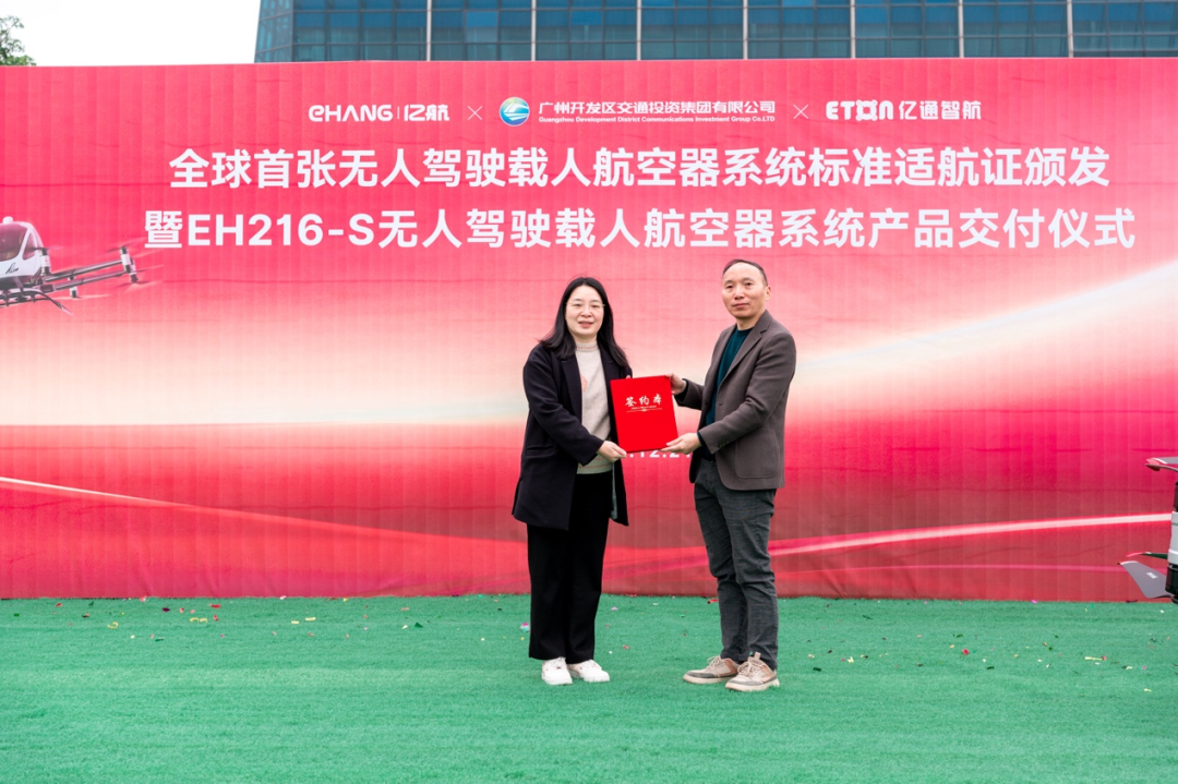 在EH216-S适航证颁证与产品交付仪式上,广州开发区交通投资集团有限公司总经理周成就先生表示:“我们很高兴获得全球首架完成认证的无人驾驶载人航空器,同时也为我们广州的本土企业在这一创新领域取得的成就感到自豪!我们对即将在广州开展的空中游览商业运营,以及与亿航智能全面合作的前景充满信心。地方政府在基础设施和投资方面大力支持,再加上亿航全球领先的更安全、更环保、更高效的,并且经认证的无人驾驶载人航空器解决方案,我们十分期待能够引领当地低空经济的发展。”