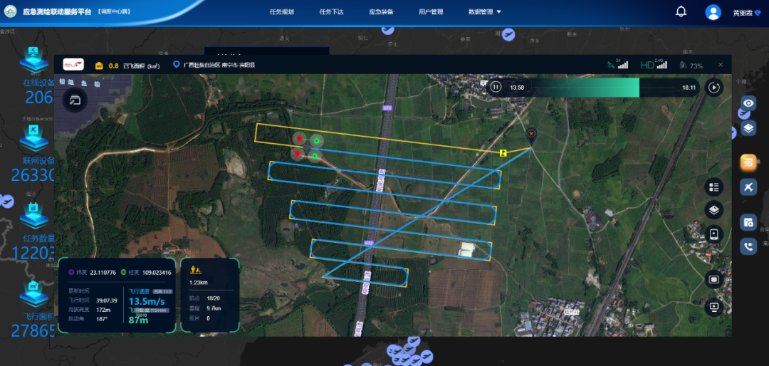 2021年1月,广西自然资源厅基于互联网思维,借鉴“滴滴打车”模式,在全国率先研发无人机应急测绘联动服务平台。依托国家应急测绘保障南宁基地,利用应急测绘服务平台,广西在全国首创应急测绘装备在线共享新模式,实现了跨平台、跨区域实时调动各类无人飞机及应急测绘队伍,实现2小时队伍到场、4小时数据回传,极大提升了广西及周边省份应急测绘快速响应和保障服务能力。