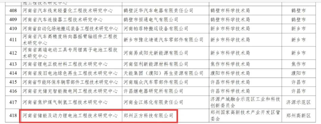近日,河南省科学技术厅发布了《关于2023年度拟认定河南省工程技术研究中心名单的公示》,经正方科技公司申报、主管部门推荐、专家论证和研究等程序,正方科技公司申报的“河南省储能及动力锂电池工程技术研究中心”正式获批并在全省进行了公示。