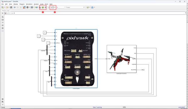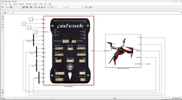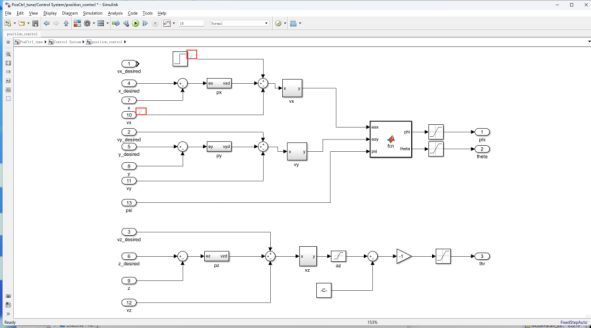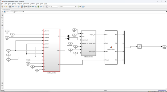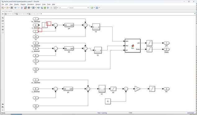 模型初始设置:PID参数步骤与姿态控制的参数调试步骤相同。先调试内环速度环,再调试外环的位置环,先调高度再调水平位置。调试文件在“e6-PositionCtrlPID-Confige6.2PosCtrl_tune.slx”文件夹中。