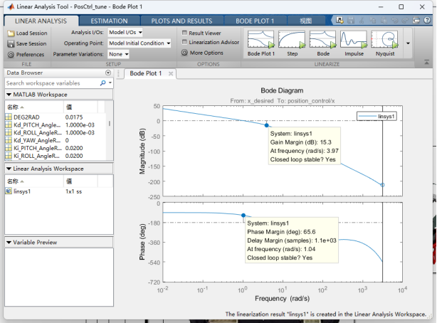 2.在得到满意参数后,对系统进行扫频以绘制Bod图,观察系统幅频响应、相频响应曲线,分析其稳定裕度。