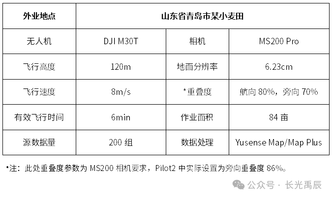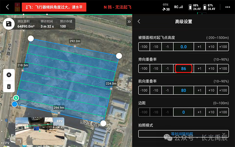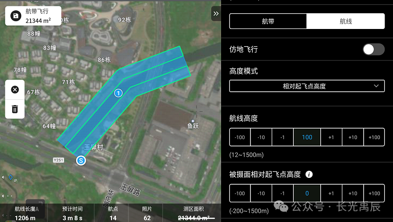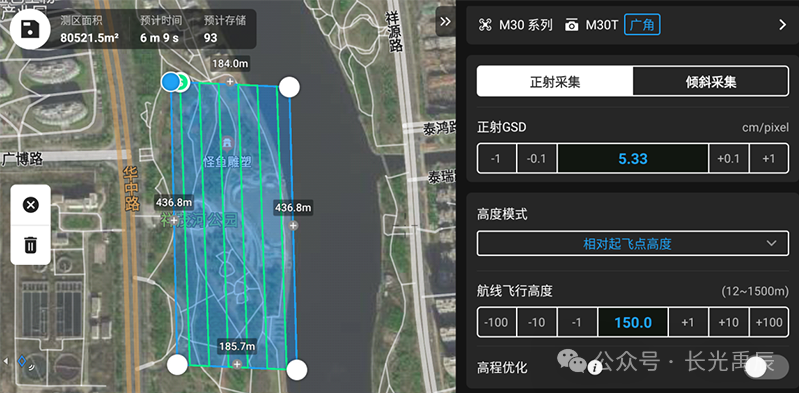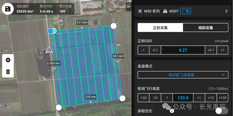 规划航线时,根据所需多光谱成果的地面分辨率(GSD)确认飞行高度,且将旁向重叠率调整至86%,其余参数保持默认。