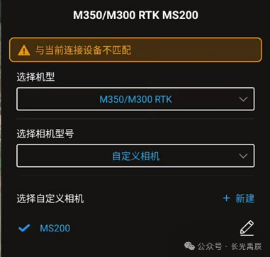 DJI pilot2 V8.0.0.38 更新后,M30无人机无法选择第三方相机参数进行航线规划,故MS200相机需借助无人机的广角相机进行参数设置。