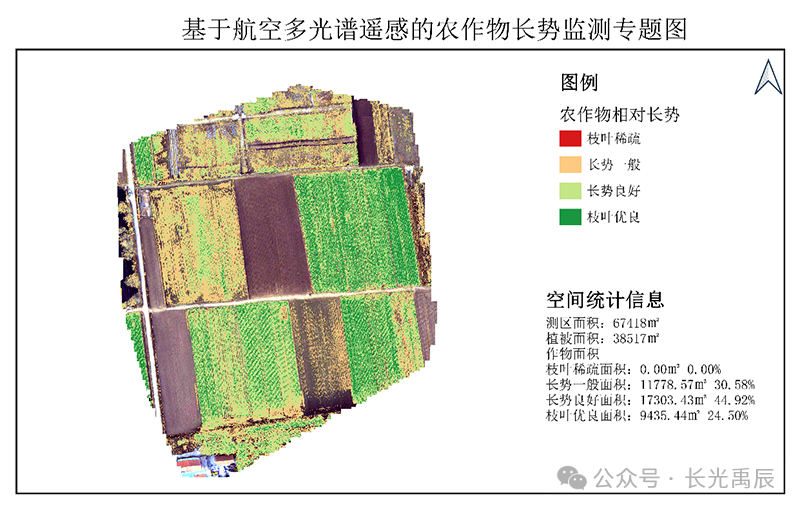 通过多光谱DOM构建模型对农作物进行长势监测,经过计算敏感性高、表征适宜的植被指数,并加入剔除阴影、杂草的自建模型,综合用于准确评估作物长势,为灌溉、施肥、植保、产量评估等提供数据支持。