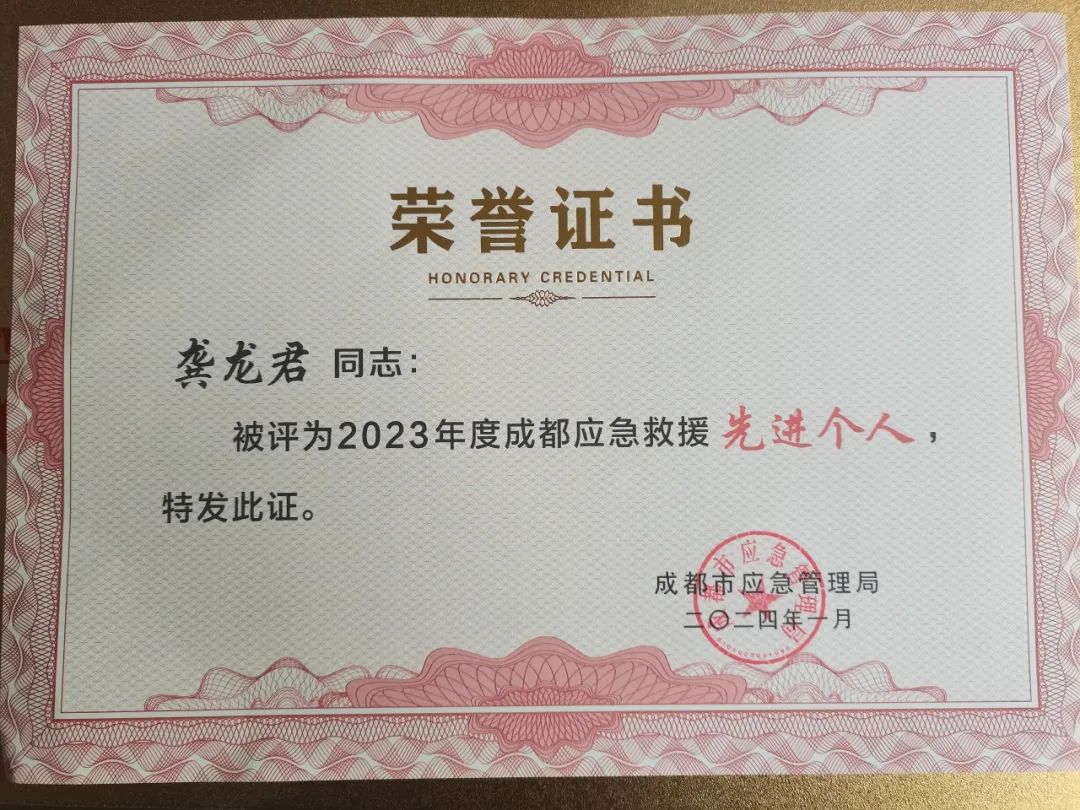 成都应急时代星光无人机保障队荣获“2023年度成都应急救援先进队伍”,队员龚龙君同志被评为“2023年度成都应急救援先进个人”。