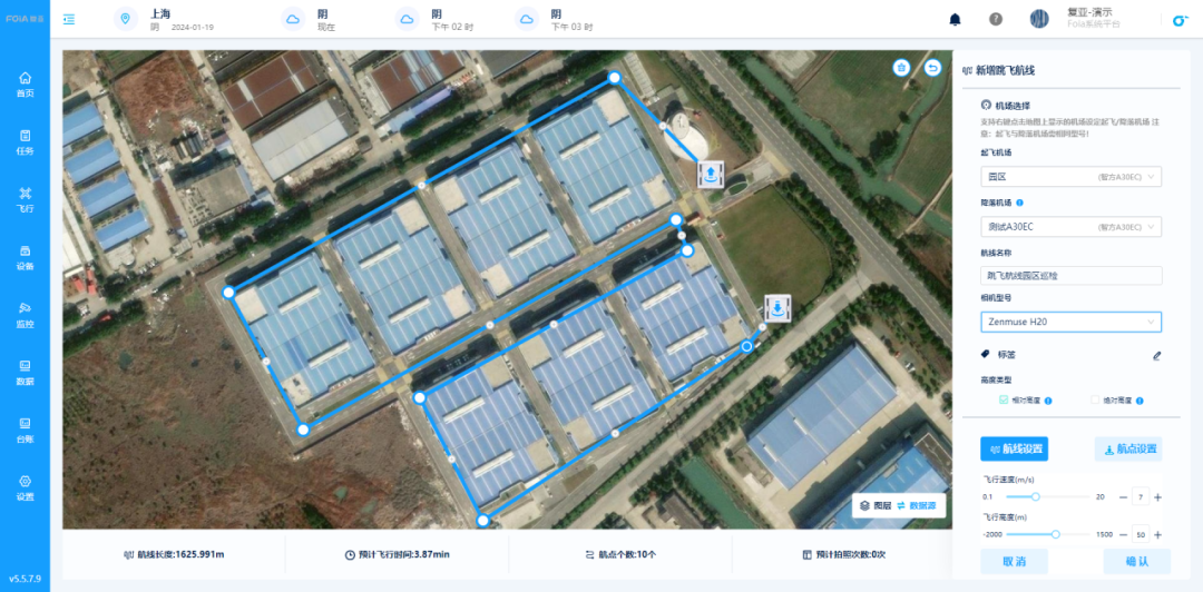 目前无人机主要在单一机场完成起飞和降落,巡检任务执行时需预留无人机往返的电量,在一定程度上限制了单个无人机单次作业的有效巡检作业半径。复亚智能的”跳飞”功能则是将无人机与单个机场解耦,突破传统无人机仅能在单一机库起降,使得无人机可以从A机场起飞,执行跳飞航线到B机场,在B机场完成降落、补能等操作。
