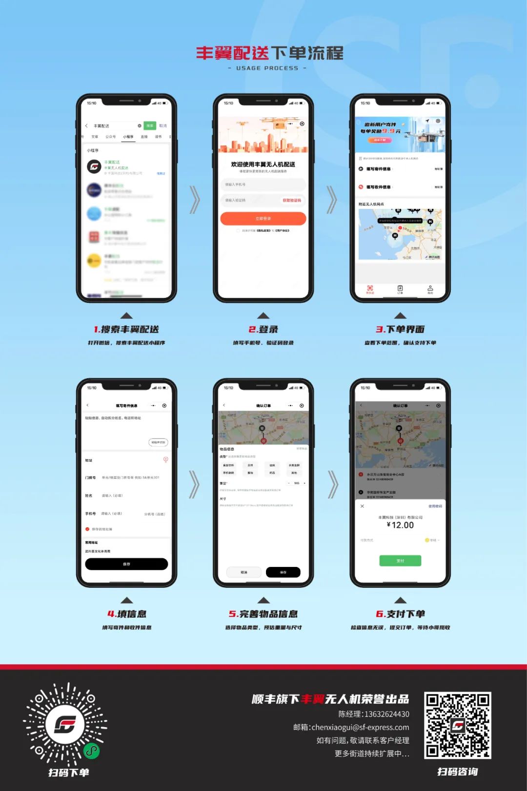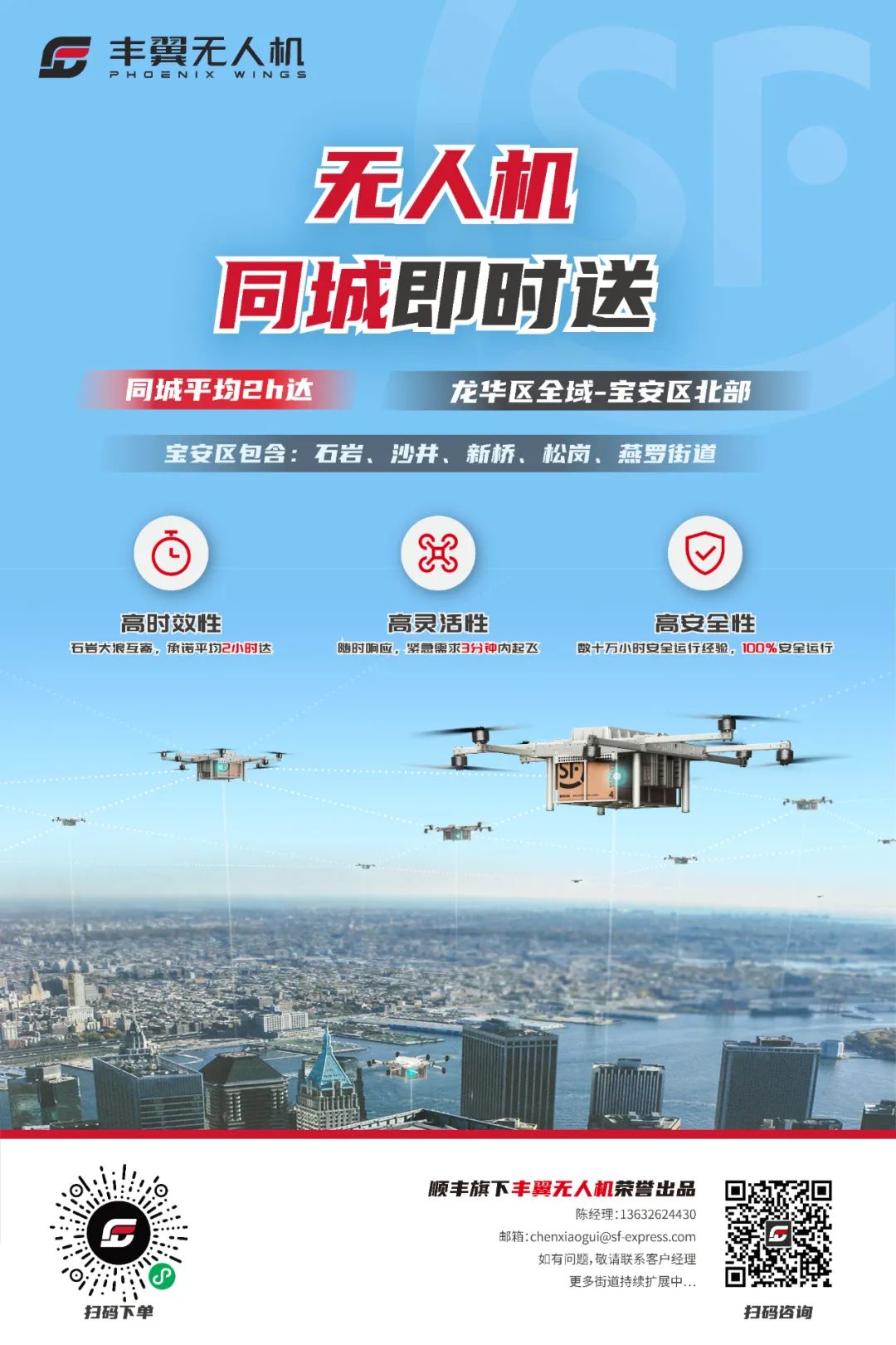 没法到现场的小伙伴也不要着急,丰翼无人机配送服务已覆盖深圳市龙华区、宝安区大部分区域,搜索“丰翼配送”小程序或是长按识别下图二维码即可开启你的第一单无人机配送,12元体验无人机同城快递(最大尺寸:67*37*25)!