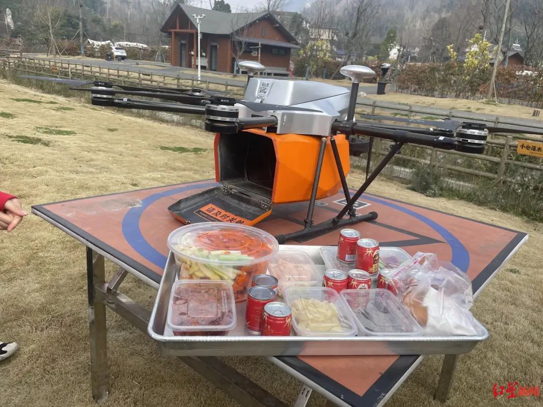 在位于成都彭州市白鹿镇的一个露营点,来自省外的游客王女士打开一款APP,点了一些火锅食材,来自彭州通济镇的无人机便搭载这些食材起飞,飞向王女士所在的白鹿镇露营点,从下单到收货,全程大约需要10分钟。