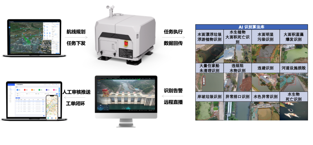 在日常巡检作业中,无人机自动巡检河道周围、入江排口等重点区域,AI 视频流识别技术实时监测,快速识别问题点。从黑臭水体到漂浮垃圾,都逃不过“无人机天眼 + AI 识别”。