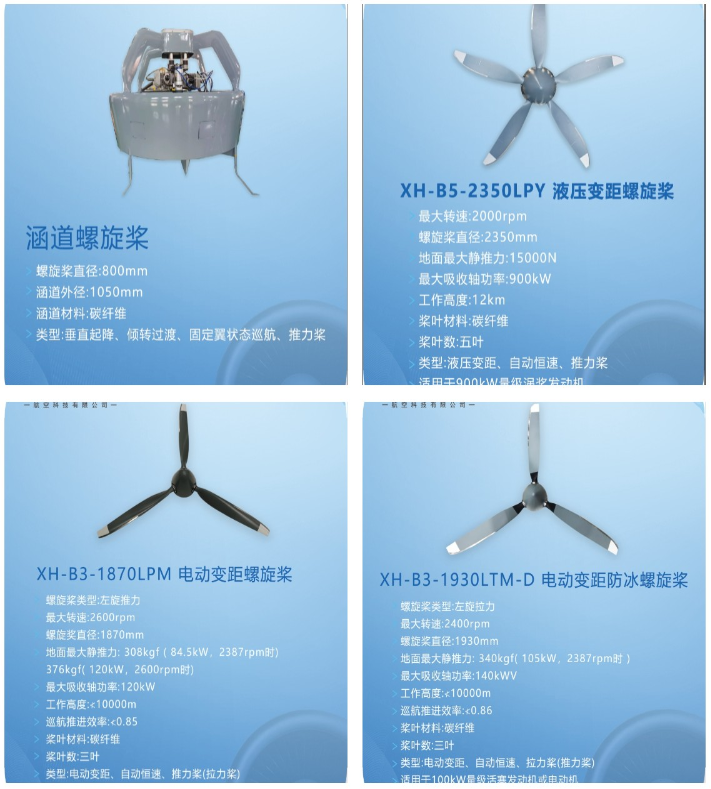 本次航展展出XH-B3-1870LPM电动变距螺旋桨、XH-B5-2350LPY液压变距螺旋桨、XH-B3-1930LTM-D电动变距防冰螺旋桨等拳头产品外,新推出了以XH-B2-800RTF-Z定距折叠螺旋桨为代表的一系列新型螺旋桨。