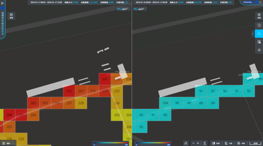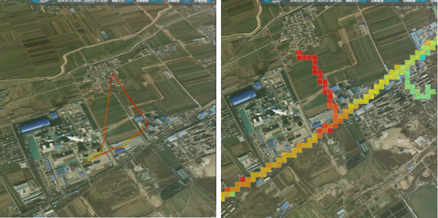 右图:“灵嗅P1-T”走航监测数据在“可飞时空大数据平台”的可视化分析