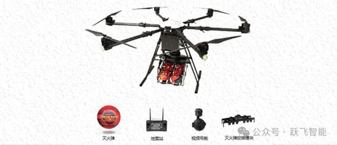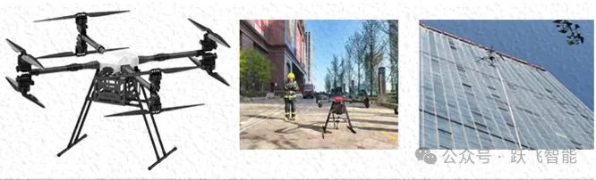 该无人机具有结构新颖,性能稳定可靠,操作灵活,维修方便、喷水距离远、流量大等特点。该无人机可装载在消防车上,能快速启动升空,通过特制高压水带与消防车水罐连接,消防车水罐内部高效泡沫/水基灭火剂输送到无人机平台,在水枪喷口水平喷射出去,达到灭火的效果。
