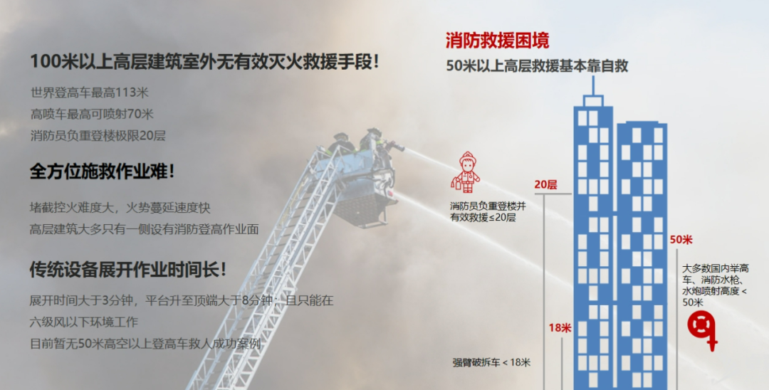 很遗憾,全球大多数地区的消防云梯工作高度一般只能达到50米,相当于18层楼高度,虽然最高的云梯车可以超过110米,但因其千万元的造价与繁琐的维护注定只能在少部分地区应用。也就是说,在大部分情况下,消防云梯对50米以上楼层起火无能为力。