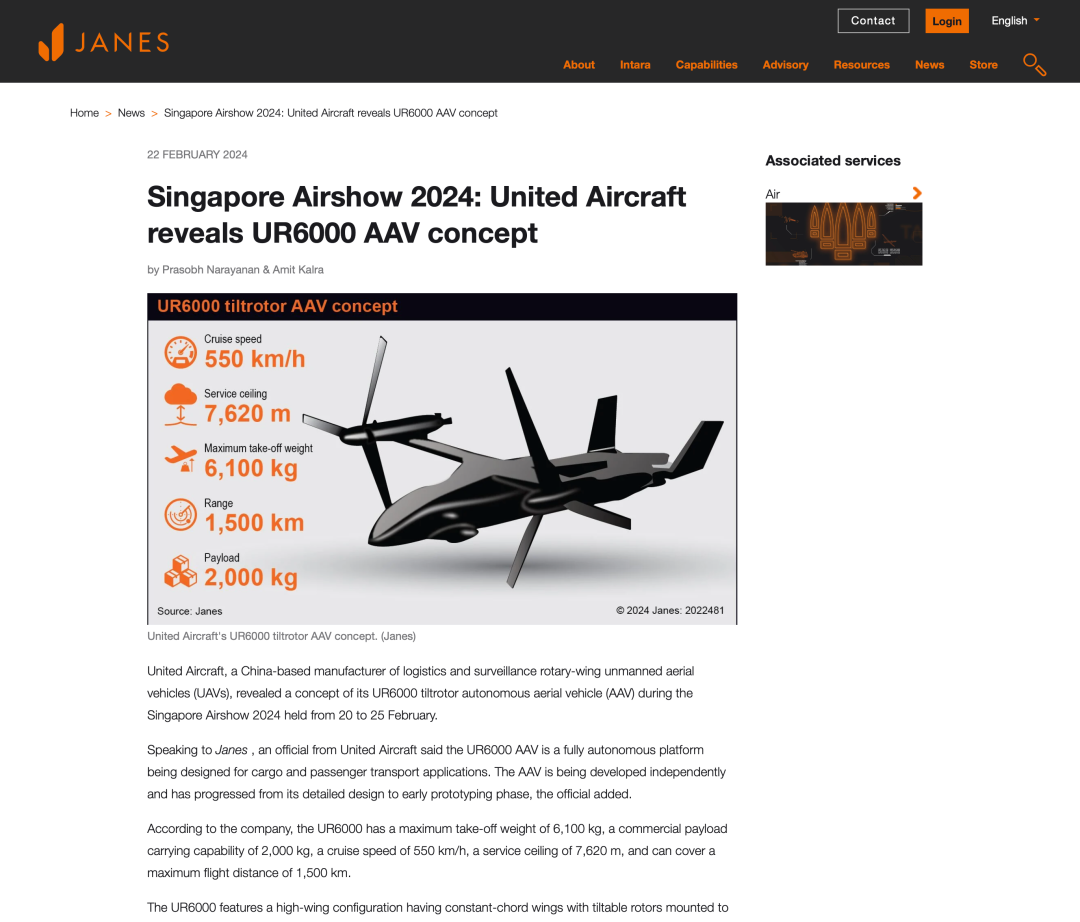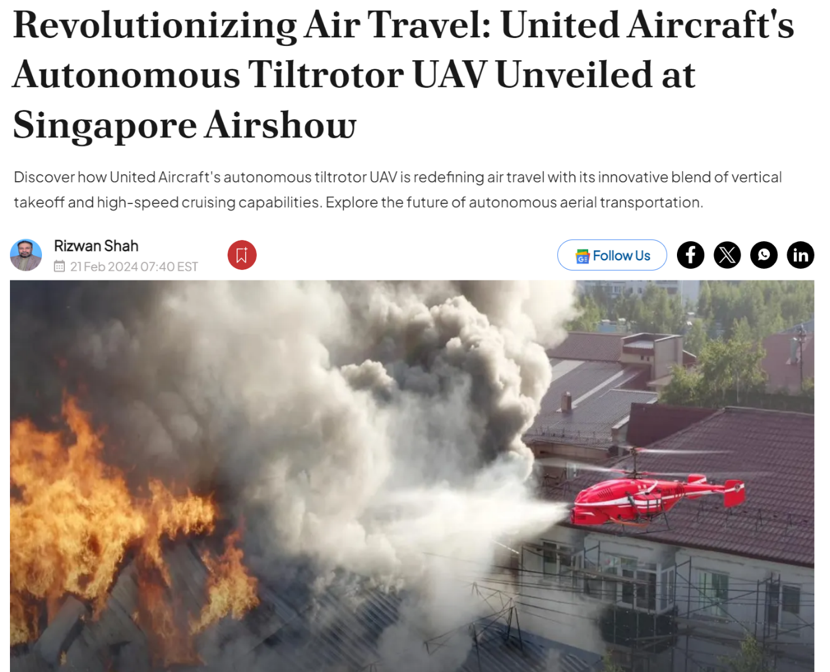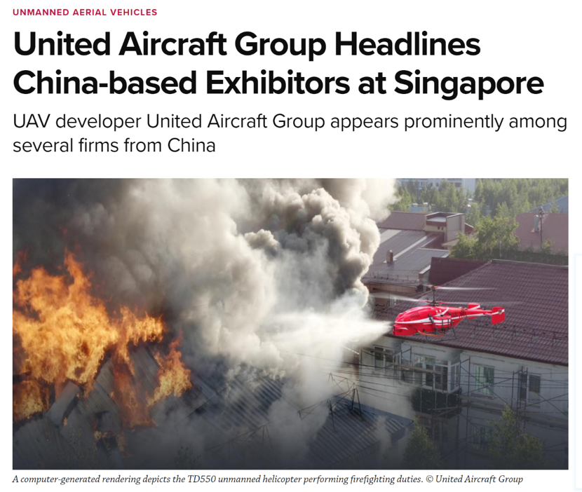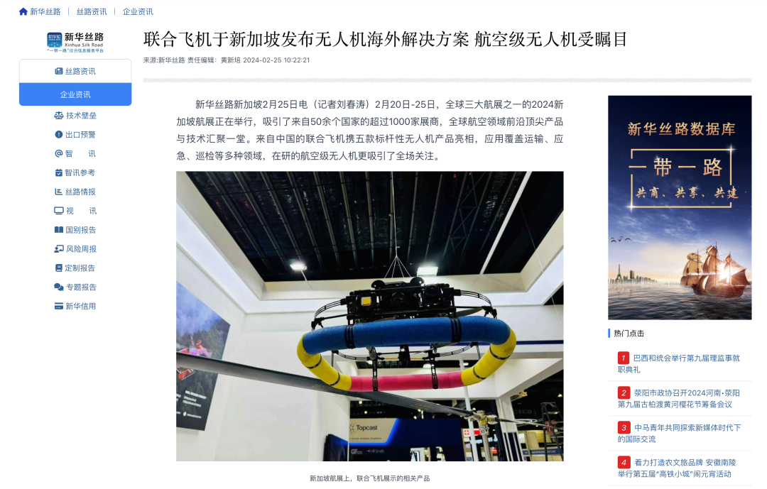 2月26日, 2024年新加坡航展圆满收官,中国无人机产业尽显发展成果与实力。联合飞机大放异彩,TD550领衔多款无人机产品广受热议,倾转旋翼无人机更是一经预告就成为全球瞩目的焦点,收获海内外50+媒体盛赞,新华社、人民日报社、中新社、全球航空航天权威媒体Aviation Week(航空周刊)、行业知名媒体Aviation International News (国际航空)、国防工业权威媒体Jane’s Defense Weekly(简氏防务周刊)、China Daily(中国日报)等媒体专题报道。