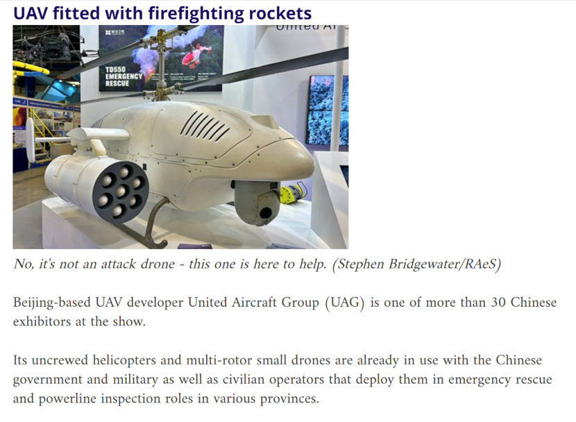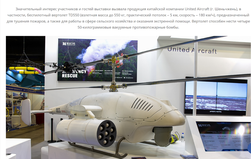 中国联合飞机的产品引起了参展商和嘉宾的极大兴趣,特别是TD550无人直升机(起飞重量高达550公斤,实用升限5000米,速度180公里/小时),能够用于灭火、农业和应急救援工作。该直升机可携带4枚50公斤消防空爆弹。