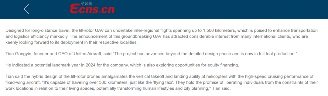 中国无人机企业联合飞机揭晓大型倾转旋翼项目