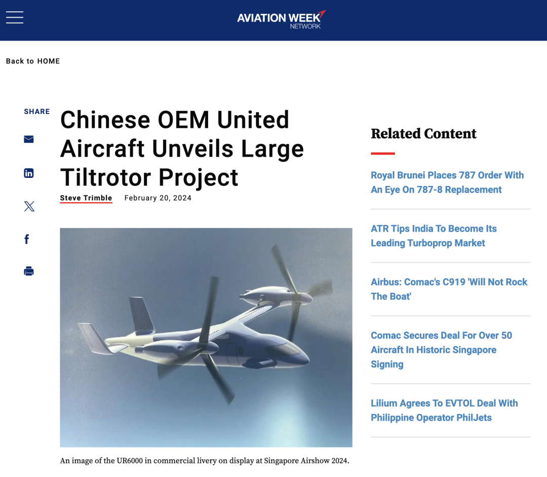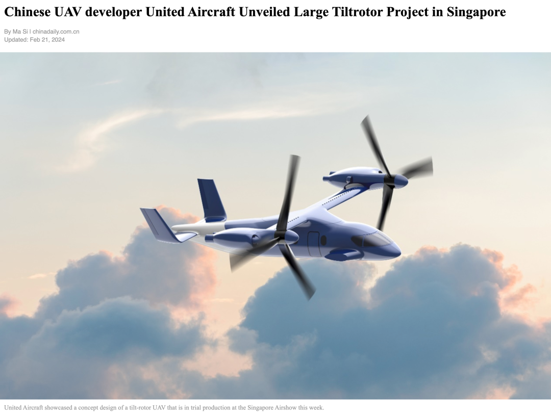中国无人机企业联合飞机在新加坡发布倾转旋翼无人机项目计划