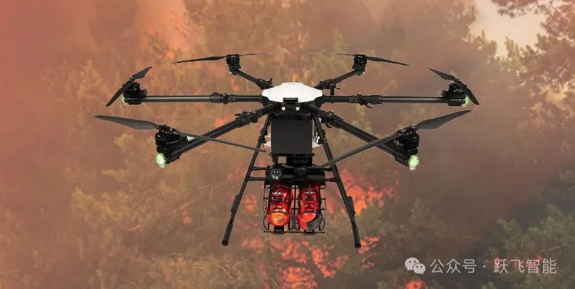 当消防车到达指定位置后,携带灭火装备的无人机立即起飞,执行灭火任务。无人机可装载灭火弹、灭火罐、破窗弹或消防水带进行灭火。