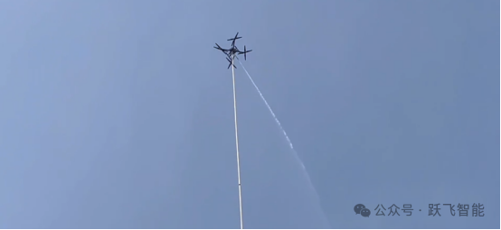 可装载在消防车上,能快速启动升空,通过特制高压水带与消防车水罐连接,消防车水罐内部高效泡沫/水基灭火剂输送到无人机平台,在水枪喷口水平喷射出去,达到灭火的效果。