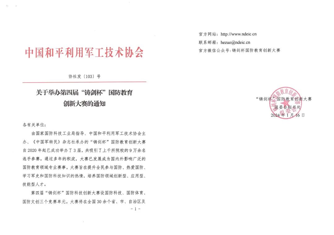 由中国和平利用军工技术协会主办,由《中国军转民》杂志社承办的第四届“铸剑杯”国防教育创新大赛发布了举办通知。