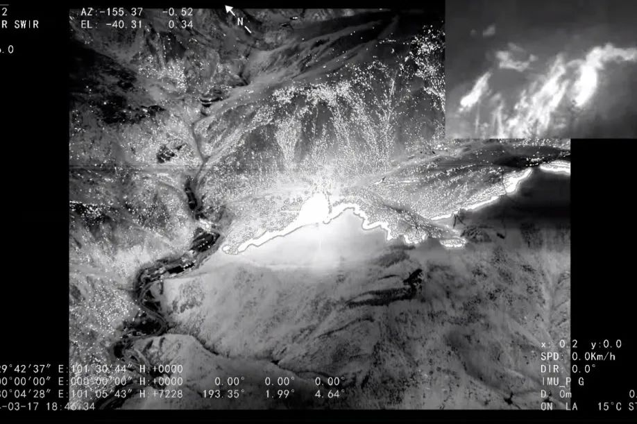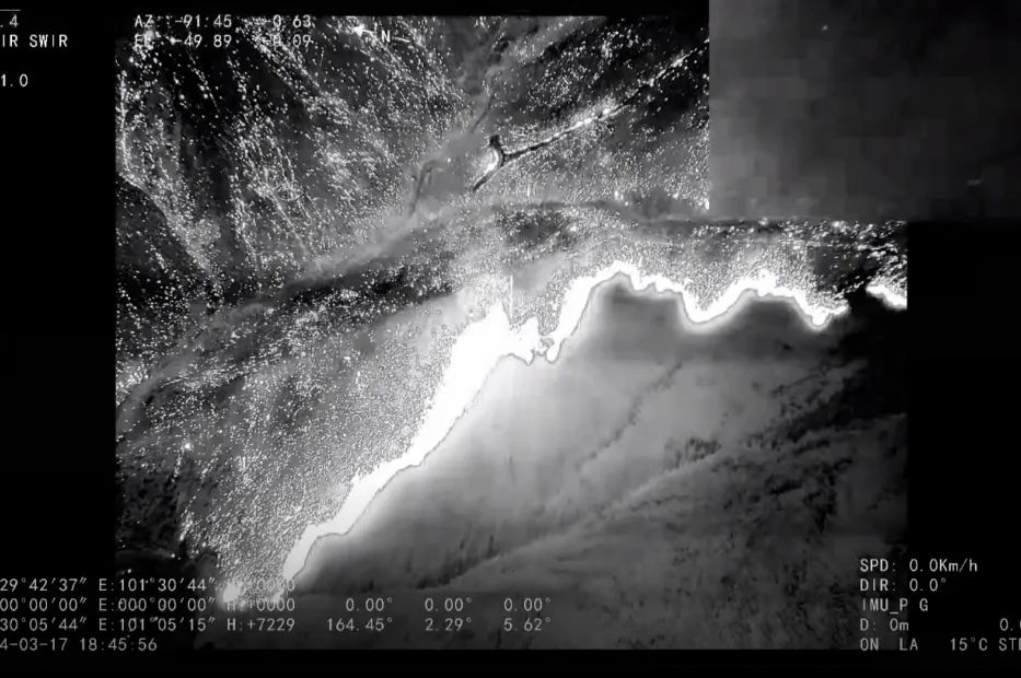 接到任务后,腾盾科创迅速完成航线规划和飞行准备,在四川省应急、航管部门的大力支持下,紧急完成空域协调。18日0时,接到放飞指令,腾盾双尾蝎无人机挂载光电侦察吊舱、卫星通信设备、全网通空中基站设备在自贡凤鸣机场冒雨起飞,飞赴雅江现场后,连续飞行近14小时,执行灾情广域巡查、火势实时监测、火场面积测量和公网通信保障支持等任务,并将火场态势和实时画面回传至指挥中心。