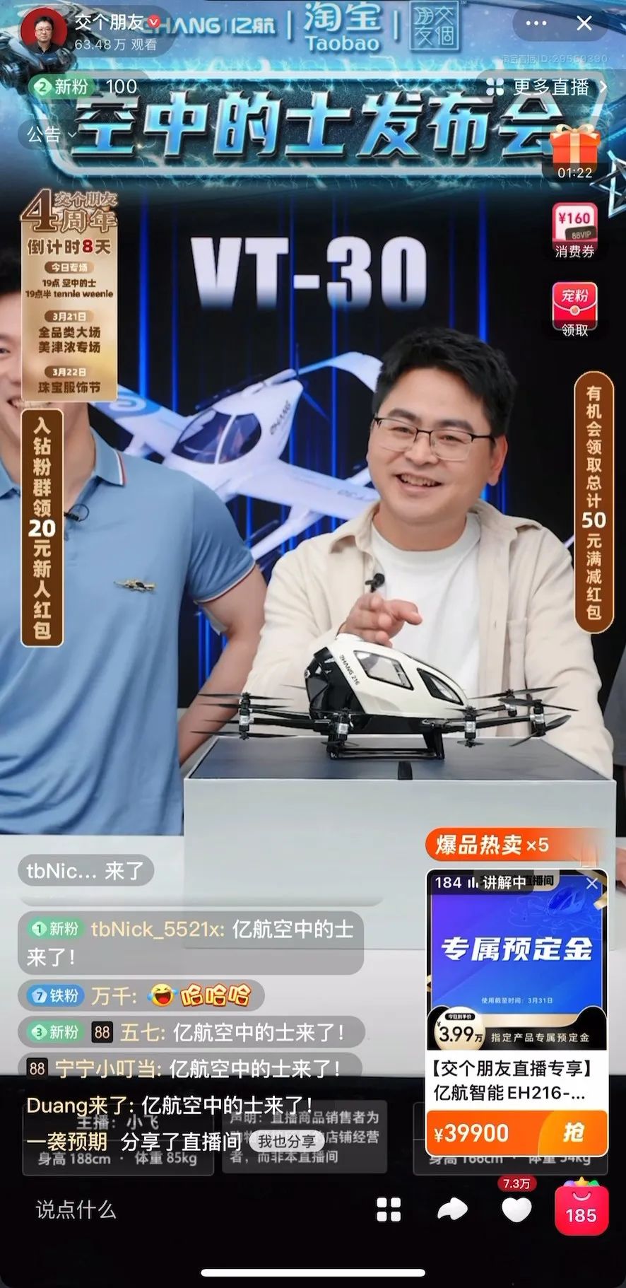 亿航智能副总裁贺天星表示,淘宝是国民级的消费平台,也是大众购买新型产品和了解前沿生活消费的平台,“交个朋友”直播间拥有广泛的消费群体。为大家提供更加安全、环保、便捷的空中交通服务,是亿航智能一直坚持的发展理念。此次三方联合推出无人驾驶载人航空器直播专场,希望通过这种形式,向更多消费者普及无人驾驶航空器的场景应用和未来发展,让大众真切的了解低空经济对生活消费的改变和影响,让新质生产力的价值惠及更多民众的生活日常。
